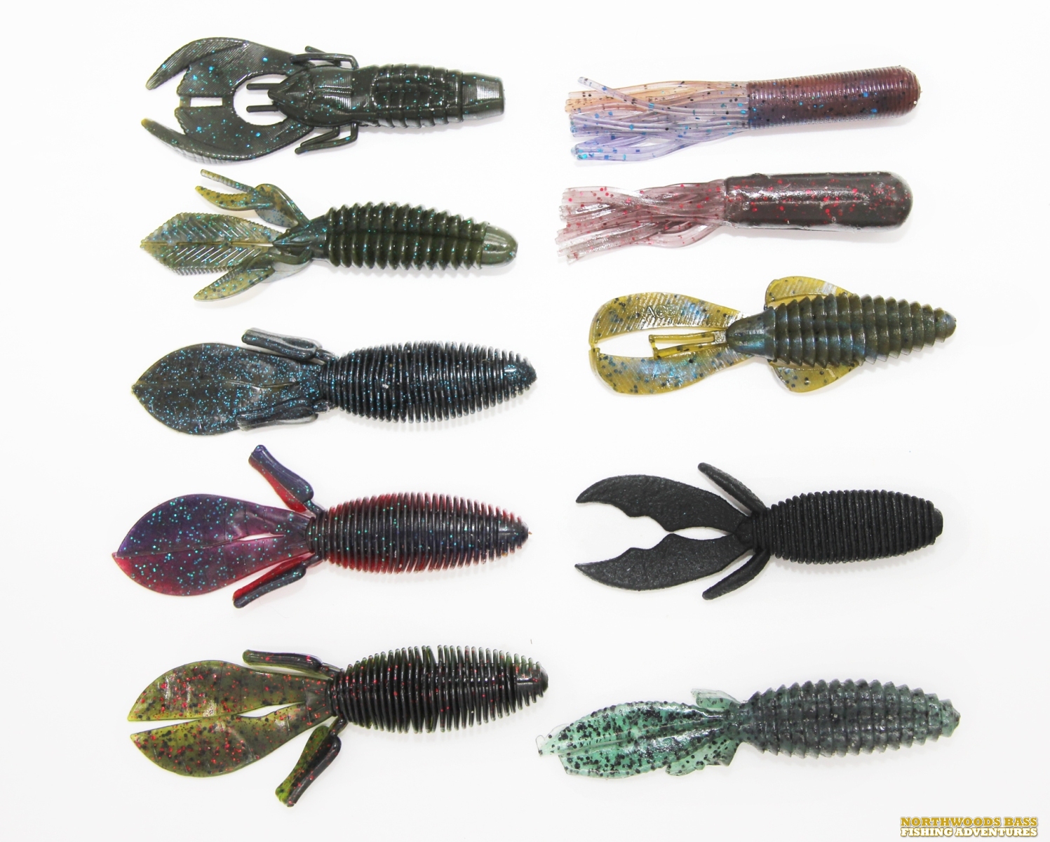 These assorted creatures are my most commonly used trailers and as standalone rigs. The assortment includes Bizz Baits Bizz Bug, YUM Wooly Bug, Missile Baits D-Bombs, Stankx Bait Co. DD Tubes for flipping, Strike King Rage Bug, Berkley MaxScent Creature Hawg, and Bearpaws Baits custom handpour.