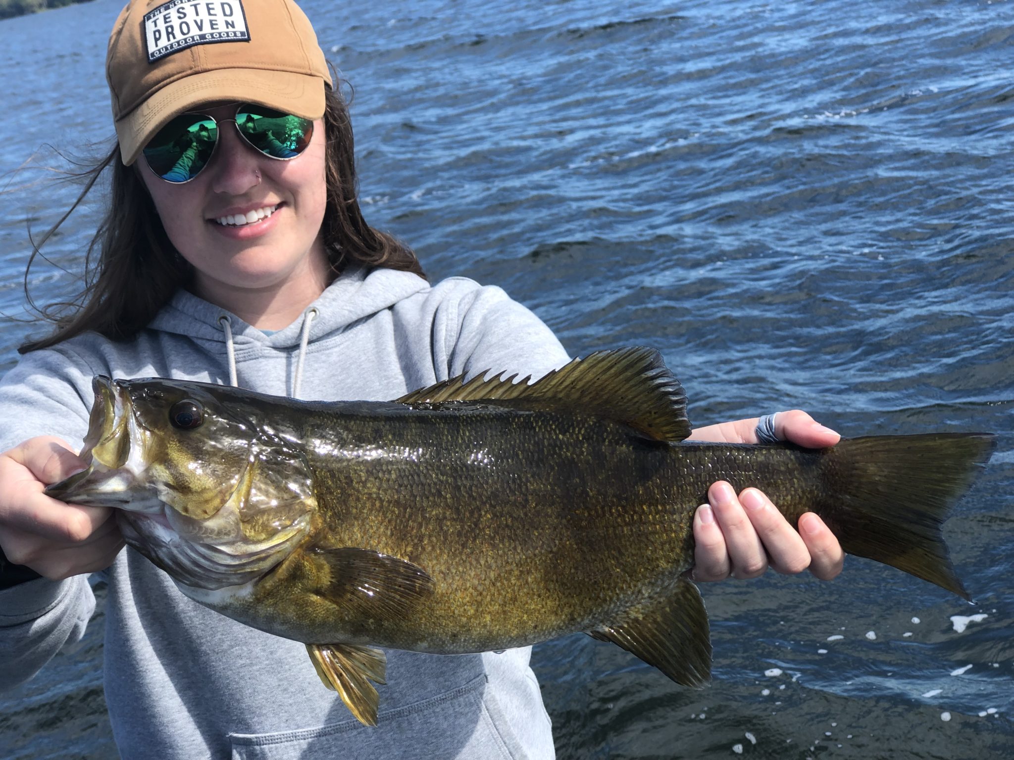 Guide customer, Courtney Warren, with her personal best smallmouth that struck a paddletail fished steadily across a huge flat.