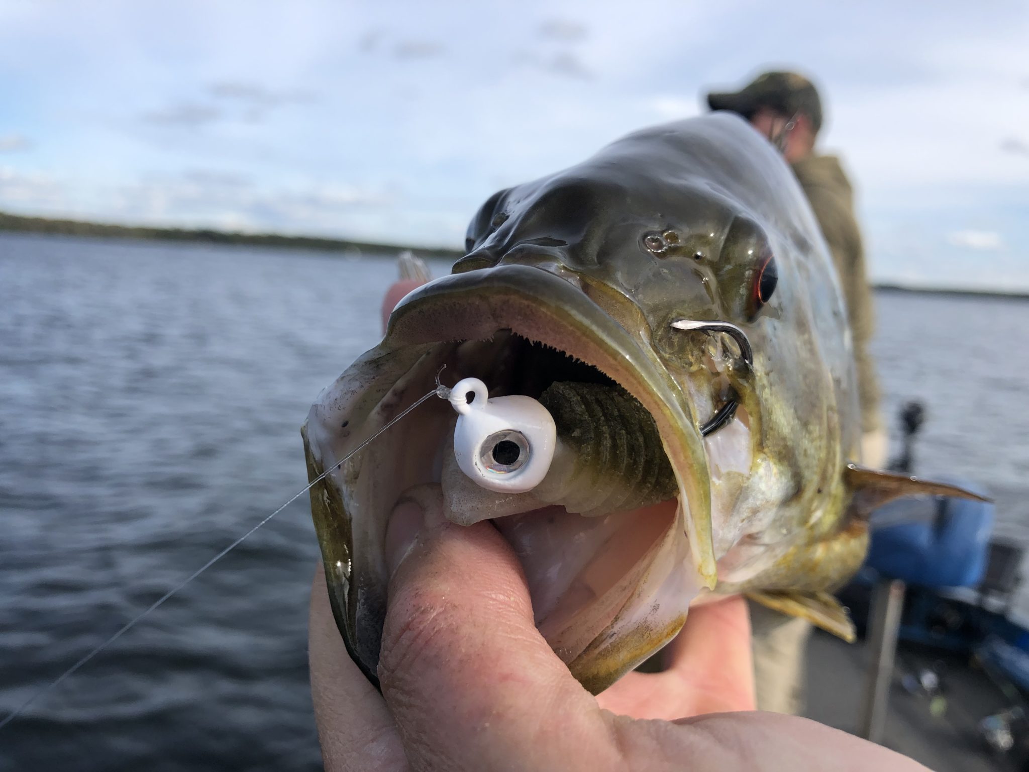 We retrieve this durable swimmer with a combination of 3/8 oz. and 1/2 oz. Trokar Boxing Glove Jigs and Northland Slurp! Jigs. During the hot swimbait bite of September 2019 with customers, the Arkansas Shad pattern accounted for several feeding frenzy smallmouth. If seeking further attraction to paddletails, consider rigging with Kalin’s new series of Google Eye Swimbait Jigs. Molded over premium chemically-sharpened hooks and available in natural colors from 1/8 oz. to ½ oz. sizes, it comes equipped with a loud rattle system that is exposed on either side of the head, tempting smallmouth with sight and sound.