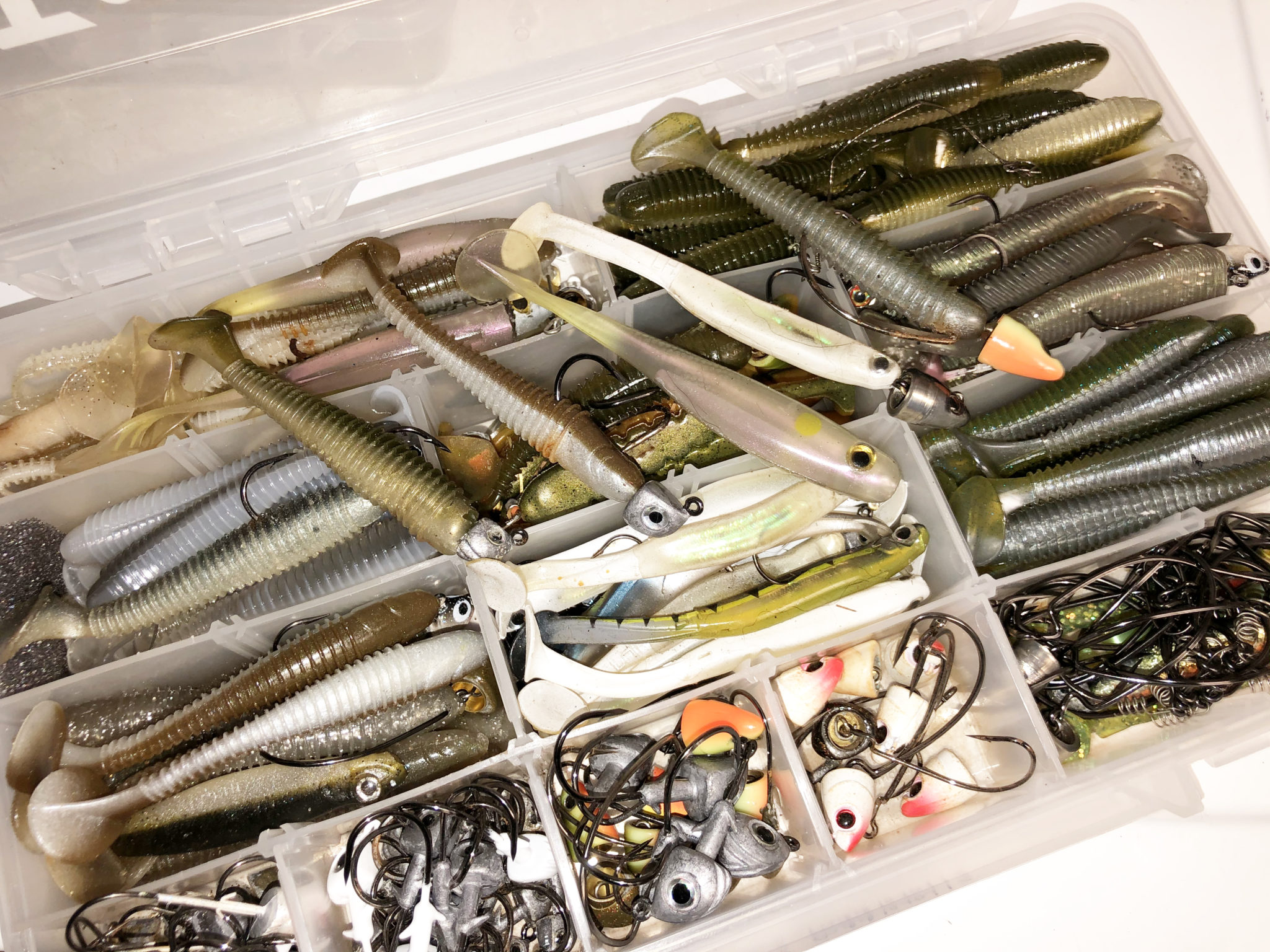 Some days, smallmouth can be picky eaters, preferring only one certain paddletail while ignoring the others. Then on other days, they will showcase no behavioral or feeding judgment, hammering everything swimming past. The only constant to the strategy seems to be the ½ oz. Trokar Boxing Glove Jigs we rig our swimmers to and bomb with.