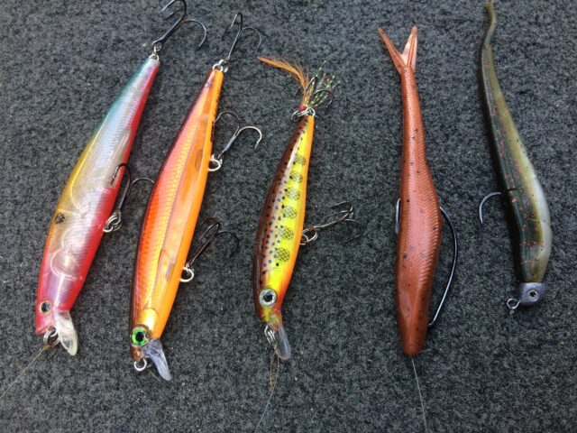 Soft jerkbaits in the “fluke” style rigged weedless and weightless are my favorites during these unique situations. My boat carries a huge mess of soft jerkbaits. Our favorite brands are Kalin’s Jerk Minnows and Jerk Minnow Jr’s, Strike King Caffeine Shads, Bass Assassin Shad Assassins, and a humongous array of custom created jerk minnows I’ve had others supply me with.